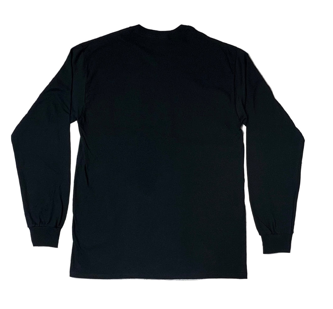 Black long sleeve tee with white & red screen print. Shirt made by Gildan 100% heavy weight cotton.